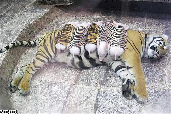 دیده بان حقوق حیوانات: در اتفاقی نادر در باغ وحشی در کالیفرنیا بچه خوکهایی که پوست ببر به تن کرده بودند ببر مادهای را که به دلیل از دست دادن فرزندانش دچار افسردگی شده بود نجات دادند.