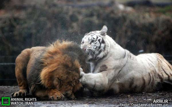 دیده بان حقوق حیوانات: در این نمای زیبا که البته در یکی از باغوحشهای بنگلادش ثبت شده، دو نمونه از بزرگترین گربهسانان روی زمین را میبینید، یک قلاده ببر سفید بنگال و یک قلاده شیر نر که سربهسر هم میگذارند.