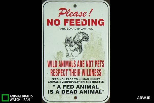 در بسیاری از پارکهای شهری و طبیعی مردم به عنوان تفریح به غذا دهی به آنها میپردازند و با آنها عکس میگیرند. در برخی مناطق مانند فضاهای خصوصی، آموزشی و دولتی، تابلوهای ممنوعیت غذا دهی به حیوانات نصب شده و حتی بدون برخورد قهر آمیز، کسی غذا دهی نمی کند.