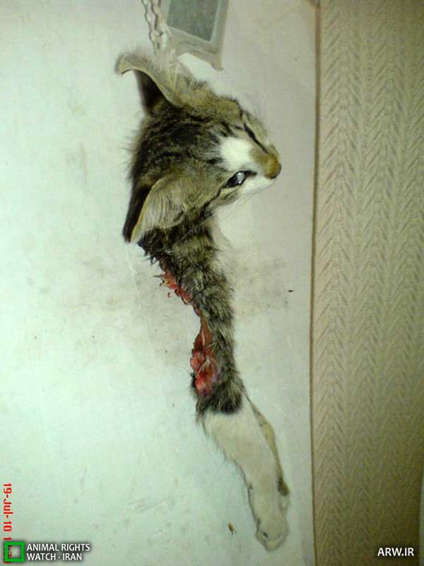 دیده بان حقوق حیوانات: “اینم آخر عاقبت بچه گربه ای که بی اجازه وارد خونه دانشجو بشه، علاوه بر اینکه دار زدیمش پوستش رو هم کندیم تا درس عبرتی باشه واسه امثال خودش که دیگه خونه یه سری یزید نیان :دی”