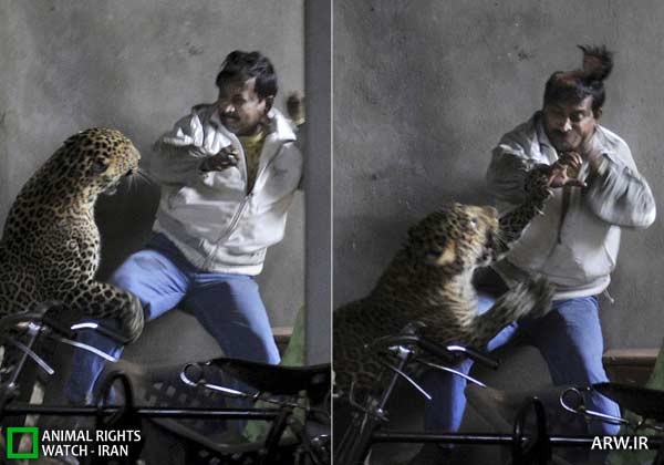 دیده بان حقوق حیوانات: در این تصویر پلنگی به این مرد حمله ور می شود و با چنگال تیز خود سر مرد را مورد هدف قرار می دهد. این عکس در آسام هند گرفته شده است.