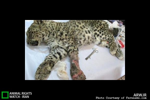 دیده بان حقوق حیوانات: يك قلاده پلنگ به دليل گرفتار شدن در تله كشاورزان منطقه گرگان در استان گلستان دست خود را از ناحيه كتف از دست داد.