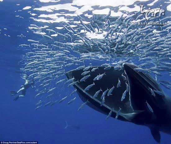 فاصله عکاس های دریایی با وال ها بسیار کم است . وال ها دهان خود را برای بلعیدن ماهی ها باز کرده اند.