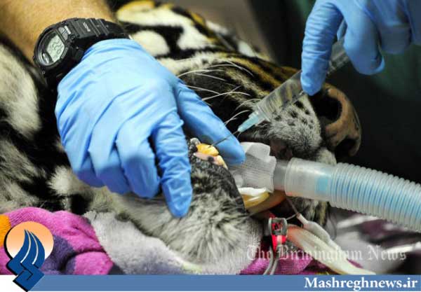 : دکتر رابرت گادیس دامپزشک باغ وحشی در بیرمنگام آلاباما در حال جراحی کانال ریشه دندان شکسته یک ببر.