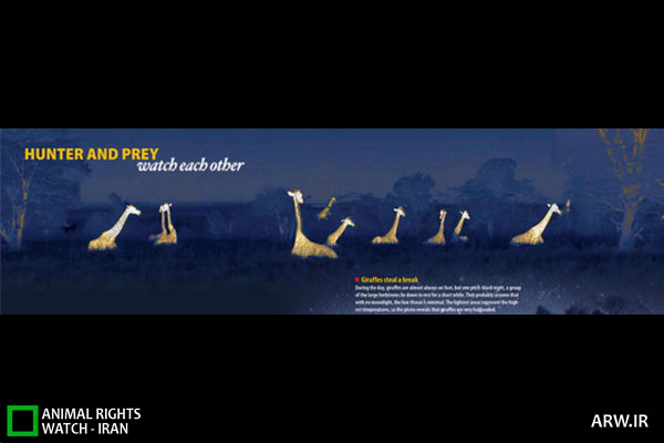 دیده بان حقوق حیوانات: در شبهای تاريك و بدون مهتاب، زرافههای 7 متری روی زمین دراز میکشند و برای مدتی کوتاه استراحت میکنند. در شرایط معمول آنها دراز نمیکشند و به حالت ایستاده استراحت میکنند، اما تاریکی مطلق چنین شبهایی که در آن چشم، چشم را نمیبیند، باعث شده شیرها هم به شکار نروند و زرافههای گردندراز با خیال راحت، دقایقی به عضلات خسته خود استراحت بدهند.