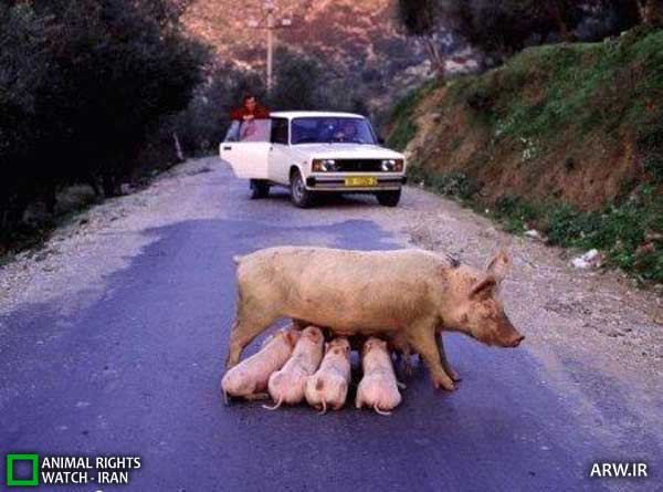 این حیوان حقوق بشر را نقض کرده است واقعا چرا حیوانات حدو مرز خود را رعایت نمیکنند؟!آخه وسط جاده !اگر خدای نکرده اتومبیلی با سرعت بالا در حال عبور ازین جاده باشد با دیدن این صحنه دچار چه سانحه ای خواهد شد؟!چند نفر باید به خاطر این خوک نه چندان تمیز کشته بشن؟