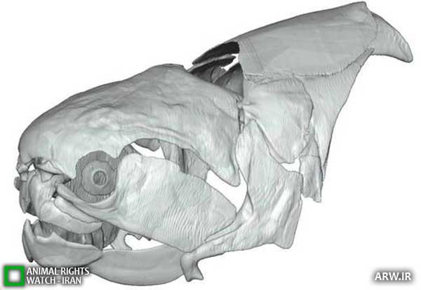 شرح عکس: نمایی از سمت کناری مدل مجازی جمجمه ماهی پلاکودرم به نام دانکولستیوس.