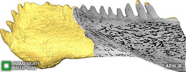 شرح عکس: نمایی از مقطع مجازی آرواره کومپگوپیسکیس که به وضوح دندانها و خطوط رشد حیوان را نشان میدهد.