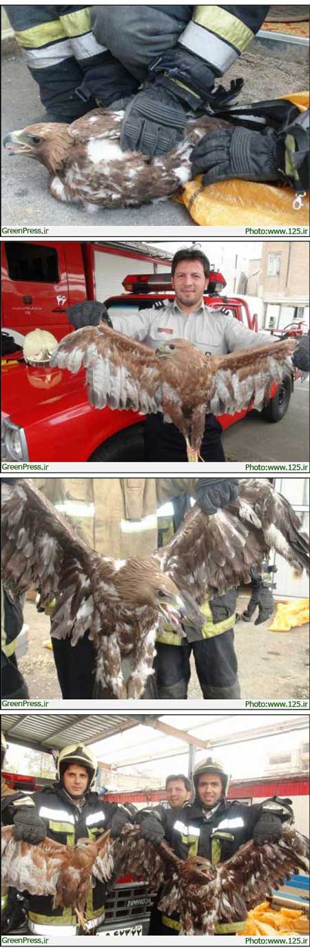 دیده بان حقوق حیوانات ایران : به نقل از سبزپرس- گزارش تصویری: حضور همزمان دو قطعه پرنده شکاری از نوع عقاب طلايي در حیاط منزل مسکونی موجب ترس و نگرانی ساکنان منزل و اهالی محل شد. ساکنان منزل مسکونی در خیابان فردوسی خیابان نوفل لوشاتو ساعت 11:28 دقیقه امروز با دیدن همزمان دو پرنده شکاری در تماس با سامانه 125 از آتشنشانی خواستار کمک شدند که در ادامه آتشنشانان با اجرای عملیات خود هر دو پرنده را بدون هر گونه آسیبی گرفتند.