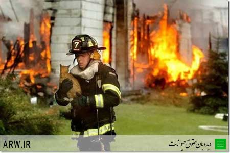 دیده بان حقوق حیوانات ایران : مامور آتشنشاني با پنج خودرو يك گربه را كه بر بام يك منزل گرفتار شده بود، نجات دادند.