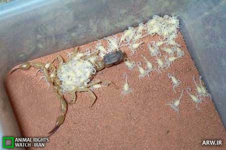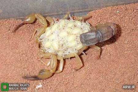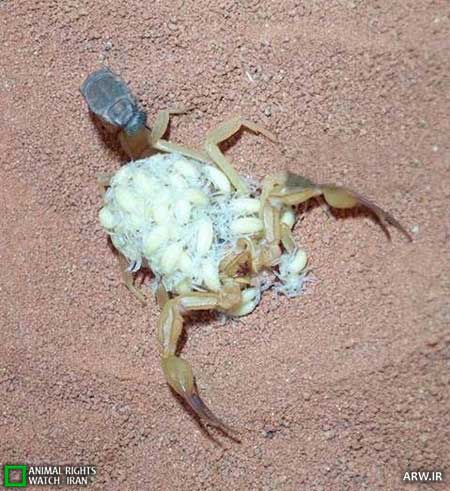 توضیح و اصلاحیه پس از انتشار: به اطلاع می رسانیم توضیحات ذیل عکس ها زاده تخیل نویسنده اصلی بوده و با واقعیت تفاوت دارد. بچه عقرب ها (مشابه بچه های عنکبوت) تا مدتی همراه مادر جابجا می شوند و به صورت گروهی به بدن مادر می چسبند.