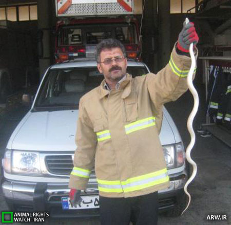 دیده بان حقوق حیوانات ایران : نجاتگران آتش نشاني با گرفتن يك حلقه مار سمي يك متري كه باعث نگراني كاسبان بازار شده بود به نگراني آنها پايان دادند.به گزارش ایرنا اين مار سمي دريك كارگاه توليد كيف در خيابان 15 خرداد شرقي، روبروي بازارآهنگران خود را در ميان كيف ها پنهان كرده بود و كاركنان كارگاه صبح امروز با ديدن اين جانور بلافاصله ساعت 7:26 دقيقه بامداد امروز – سه شنبه – در تماس با سامانه 125 درخواست كمك كردند و گروه نجات يك آتش نشاني به محل اعزام شد.