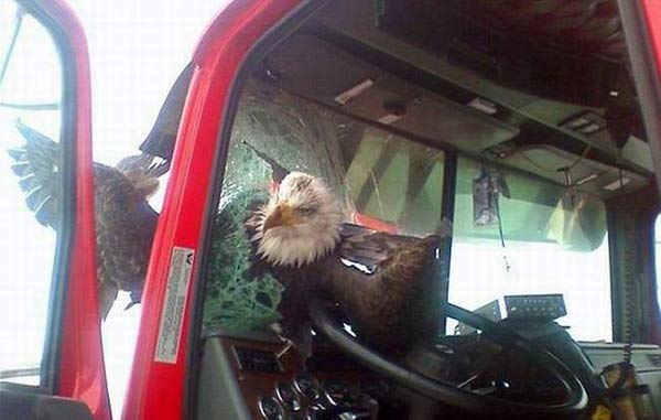 دیده بان حقوق حیوانات: این عقاب در حال پرواز با یک کامیون برخورد میکند و باعث شکسته شدن شیشه کامیون می شود، با این حال به شکل باورنکردنی زنده می ماند!