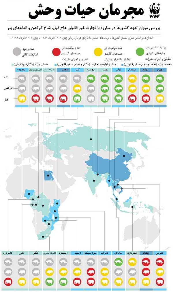 در حالی که تقاضا برای عاج فیل در بازارهای آسیا رو به افزایش است، در آفریقا سالانه هزاران فیل سلاخی میشوند تا این نیاز را تامین کنند. همینطور کرگدن و ببر به دلیل بازار های مناسب در چین و ویتنام هدف شکار روزافزون غیرقانونی هستند. برای روشن شدن وضعیت، بنیاد جهانی حیاتوحش نگاهی انداخته است به چگونگی مبارزه کشورهای مختلف با تجارت غیرقانونی اعضای حیوانات و شکار آنها و نتیجه این تحقیق، در قالب اینفوگرافیکی آماده شده که در آن، بدترین کشورها از نظر محافظت از گونههای در حال انقراض نشان داده شدهاند. بر اساس گزارشها، تقاضای بالا وهمینطور عدم سختگیری در مبارزه با قاچاق، شکار و تجارت مبتنی بر اعضای حیوانات مهمترین عوامل در نظر گرفته شده برای این مطالعه هستند.