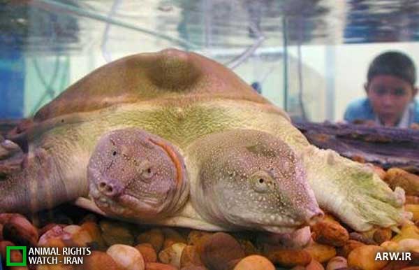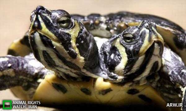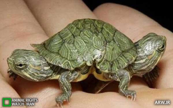 یک لاکپشت که با دو سر و یک جفت پای میان آنها متولد شد. عکس در یک فروشگاه فروش حیوانات در شهر