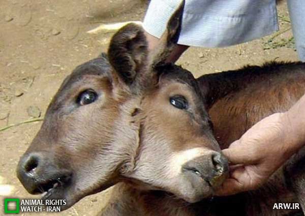 Hereford گوساله با دو سر پیوسته به بطری تغذیه در یک کلینیک دامپزشکی در گوزن گراو ، کالیفرنیا در 2 آوریل ، 1987 که تصویر آن توسط صاحبش دیک هری گرفته شده است. گوساله ماده دوازده روز می تواند با هر دو دهان غذل بخورد، اما از یکی راحت تر است.