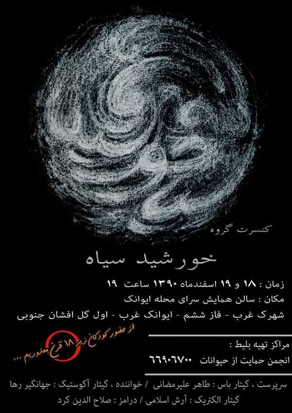 در پاییز سال ۱۳۹۰ گروه خورشید سیاه تشکیل شد و به عنوان “اولین و تنها گروه حامی محیط زیست” با آهنگ هایی درزمینهی مشکلات محیط زیستی و خشونت علیه حیوانات و همچنین مشکلات اجتماعی آثار خود را به جامعه معرفی کرد. اولین آلبوم این گروه، «خرس سیاه بلوچی» نام داشت و چنان که از نامش هم برمیآید مربوط به خرس در حال انقراضی است که در منطقه بلوچستان زیست میکند.