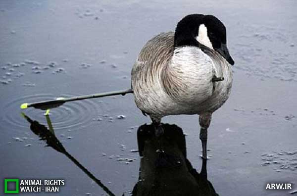 دیده بان حقوق حیوانات ایران: این غاز خاکستری توسط محیط بانان “پارک طبیعت” دنور در ایالت کلرادو آمریکا به یک کلینیک دامپزشکی منتقل شده است. نکته قابل توجه آن است که غاز با وجود عبور تیر از سینه اش زنده مانده و فقط از وجود تیر رنج می برده است.
