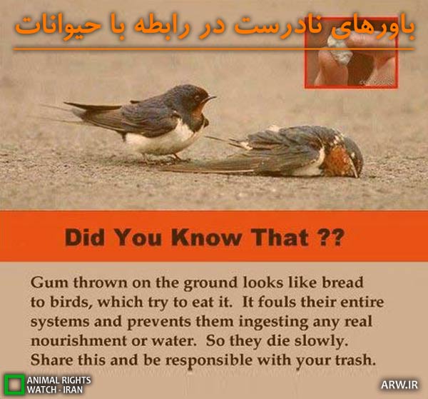 دیده بان حقوق حیوانات: «آیا می دانستید آدامسی که به روی زمین پرت میشه برای پرنده [ها] حکم تکه نان را دارد و وقتی پرنده اقدام به خوردن آن می کند در [گلو] گیر کرده و مانع از این میشه که پرنده هر نوع آب و غذای واقعی را قورت بدهد؟ به این ترتیب پرنده به طرز دردناکی آن هم ذره ذره جان می دهد. این مطلب را به اشتراک بگذارید و مسئولیت زباله هایتان را عهده دار شوید.»