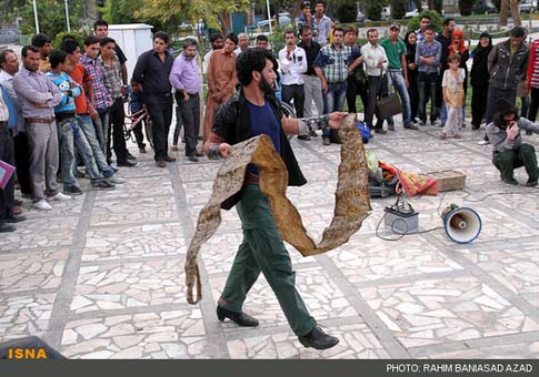 این معرکه گیر در بخشی از نمایش تکراری هر شب خود در پارک شهر ورزنه، میمونی که در قفس نیم متری اسیر است و یک مار یک و نیم متری را با رفتاری آزارنده تحریک می کند تا با داستان های سرتاسر دروغ از زندگی خرس و مار و میمون، از مردم انعامی بگیرد و این آزار را تا خرس و میمون و مار جانی در بدن دارند ادامه دهد.